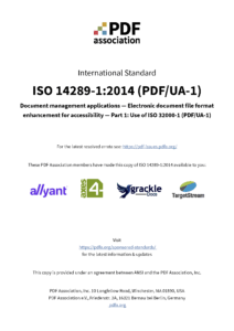 ISO 14289-1:2014 (PDF/UA-1) defines the use of tagged PDF in files conforming to ISO 32000-1:2008 (PDF 1.7) to ensure accessible content.