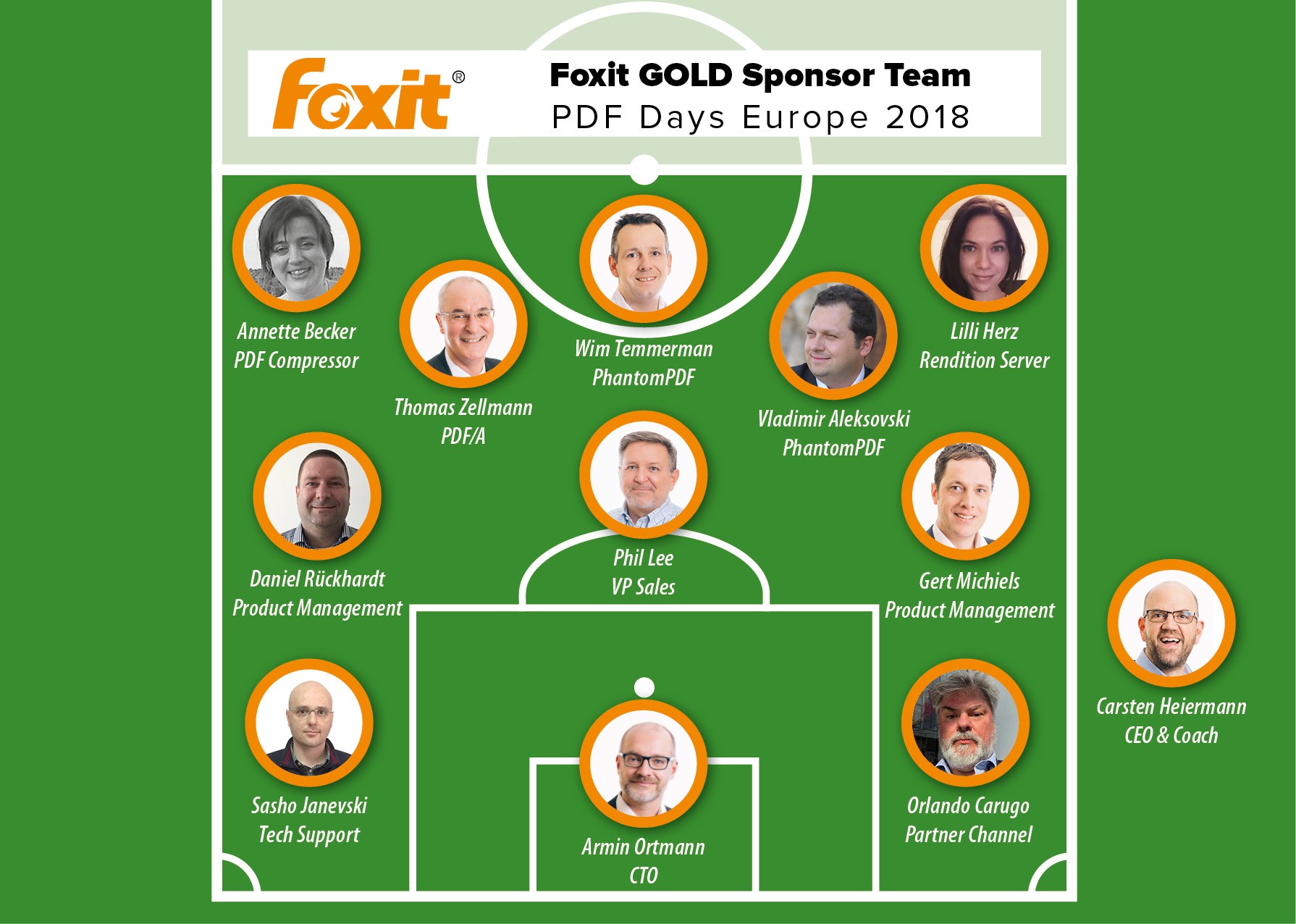 Im Fußball-WM-Jahr 2018 präsentiert sich das Team von Foxit Software als leistungsfähige Mannschaft auf den PDF Days Europe. Bei dem Heimspiel in Berlin wird CEO und Coach Carsten Heiermann vom Anstoß am 14. Mai bis zum Abpfiff am 16. Mai mit elf hochmotivierten Playern präsent sein. Im SI Steglitz International Hotel zeigt das Team, was es an schnellen, erschwinglichen und sicheren PDF-Lösungen zu bieten hat.