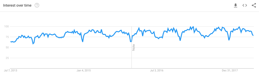 By contrast, pdf's popularity in Germany has continued relatively steady, although Germany sees much less seasonality as compared to the USA. Perhaps PDF is more fully integrated into German’s personal lives? Observe that peak PDF in Germany occured in June, 2018… at that time many Germans were searching for “wm spielplan pdf” and variations thereof. Or, at least they were until June 27, 2018...
