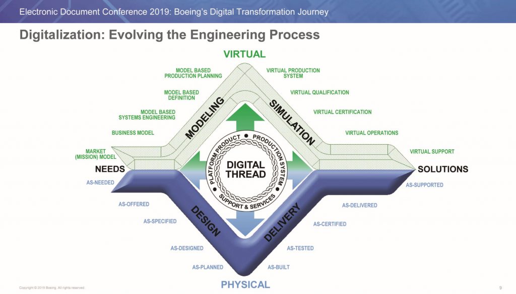 The second day started with a keynote from Kenny Swope from Boeing. He showed how his company thinks and introduces digitalization: It is not just about putting computers onto the office desktops in the company. It is about rethinking the way processes are organized and performed. In a production oriented company like Boeing, it is not just replacing paper with PDF in office processes. Facilitating workflows means to use rich features of PDF such as 3D models (in PDF annotations) or embedded files in smart ways that were never possible with paper. Complex processes are involved in the creation of an airplane from acknowledging a need to delivering and maintaining an airplane and it is easy to see that all these processes require active management of their documentation. Digitalization of such complex processes can’t just take place on an operational level but becomes a central task for the overall management of the enterprise.