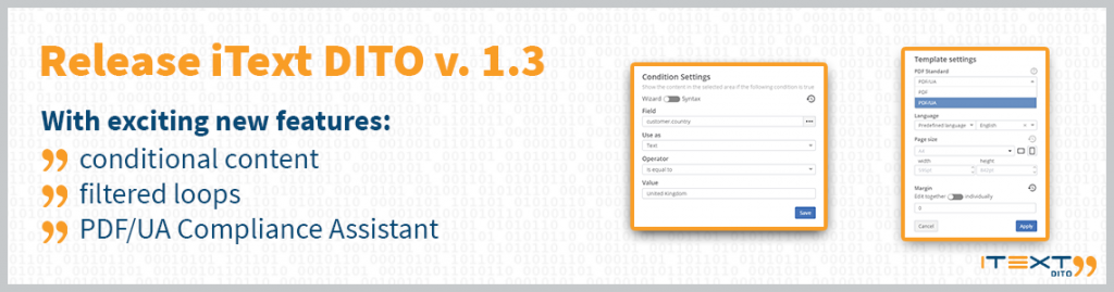 We are excited to announce the general availability of iText DITO v. 1.3. This latest release of iText’s low-code PDF generator contains several new features and optimizations of existing capabilities, all targeted towards the realization of iText’s mission to provide a high-convenience PDF generation product that combines WYSIWYG template design in the browser, with a powerful PDF generation engine built to handle enterprise-level requirements and volumes.