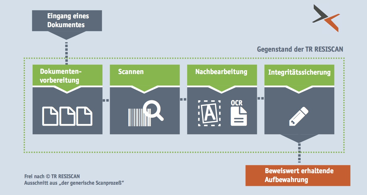 Das scheint auch kein Wunder zu sein. Schon im e-Government-Gesetz, in Kraft getreten am 01.August 2013, wurde auf die TR Resiscan Bezug genommen als ein Beispiel für ersetzendes Scannen nach dem Stand der Technik. Und ersetzendes Scannen wird ausdrücklich im Zuge der Einführung der e-Akte gefordert. Da heißt es in §7, Absatz 2: