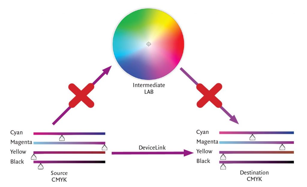 This is where DeviceLink profiles come in. A DeviceLink profile is always between two color spaces and it does not pass through L*a*b*to do its conversion. DeviceLink profiles contain the intelligence to go straight from the input to the output color space and to do so while handling special colors in a good way. So, in what scenarios can they be helpful.